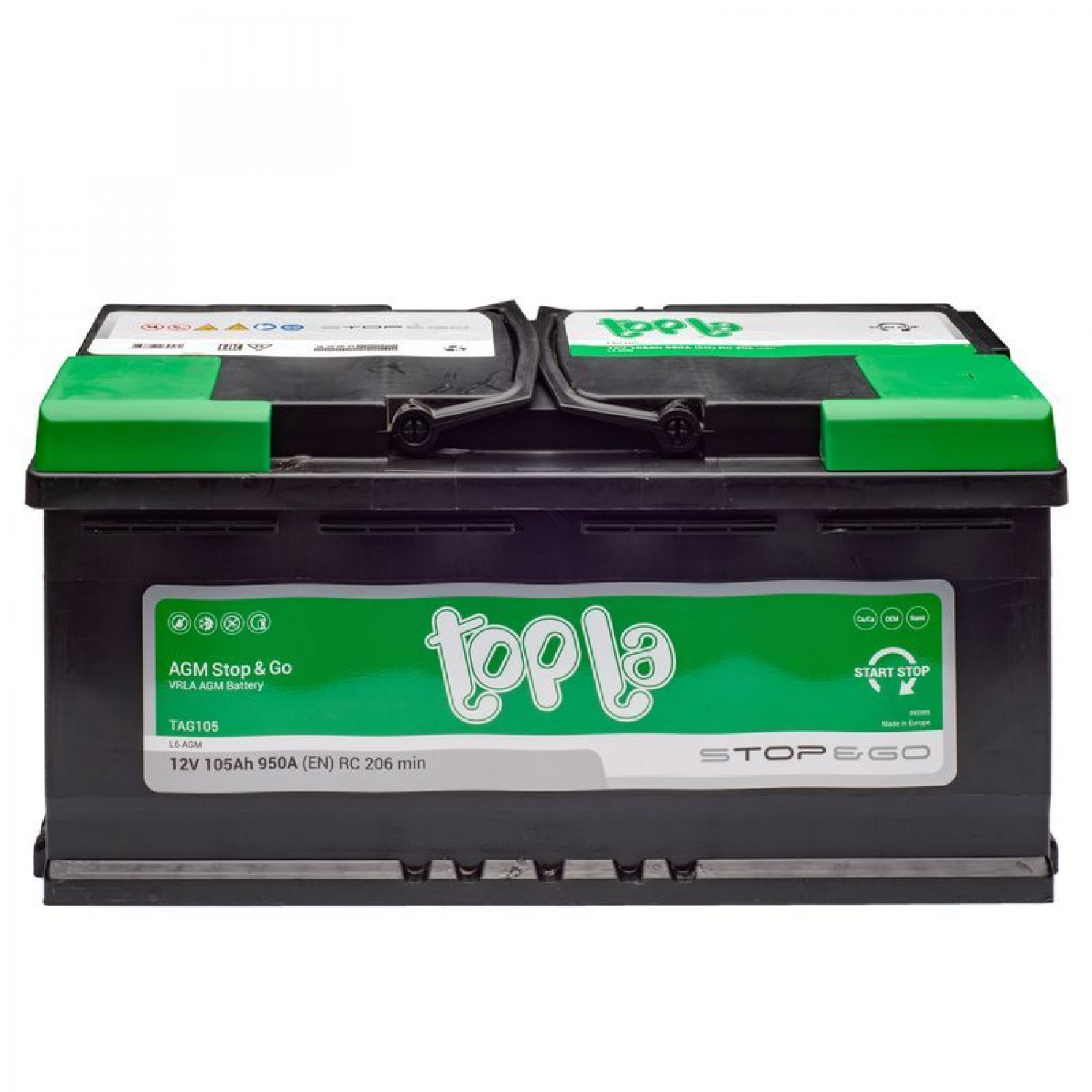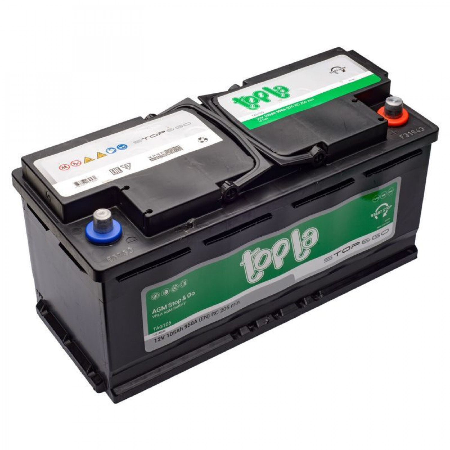 Topla AGM Stop&Go клапанно-регульовані свинцово-кислотні батареї (VRLA), призначені для використання в транспортних засобах з розширеною функцією СТАРТ/СТОП, де застосована функція рекуперації енергії. Батарея VRLA AGM – це свинцово-кислотна покращена батарея з максимальною продуктивністю. Це герметична батарея, створена за технологією AGM (Absorbed Glass Material), в якій електроліт абсорбується в сепараторах із спеціального скловолокна, які гарантують захист від захисту електроліту навіть при пошкодженні корпусу.