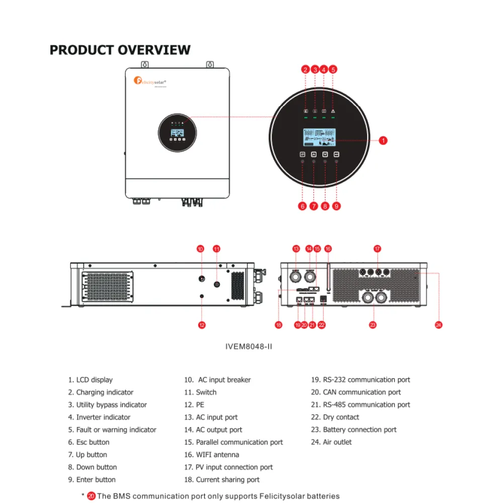 Felicity IVEM8048-II — потужний гібридний інвертор для автономних і резервних енергосистем, який об’єднує в одному пристрої інвертор з чистою синусоїдою, зарядний пристрій, MPPT-контролер сонячних панелей і ДБЖ з онлайн-топологією.